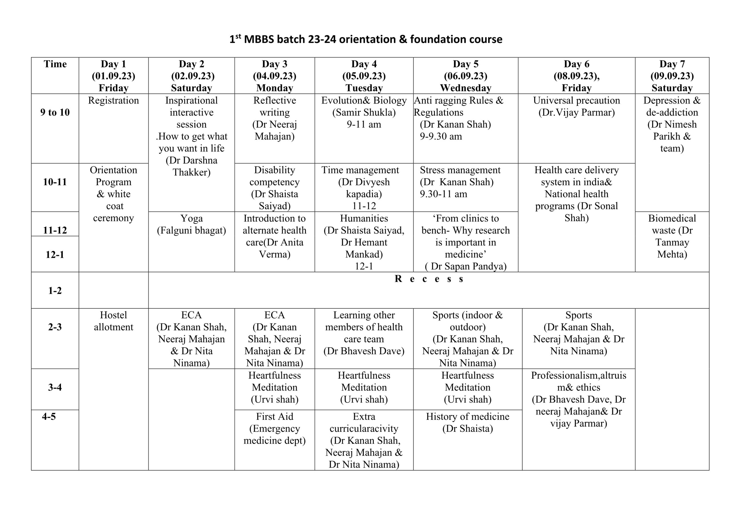 Foundation course time table for MBBS – 2023 Batch